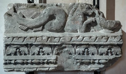 - Meerwesen: Hippokamp nach rechts, vor ihm Krater. Unterhalb Blattstab, Kyma, Astragalstab, tordiertes Band.
