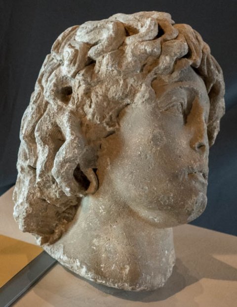 - zur Seite geneigter Kopf eines Jünglings (?) mit langen Locken. Mythische Figur ?