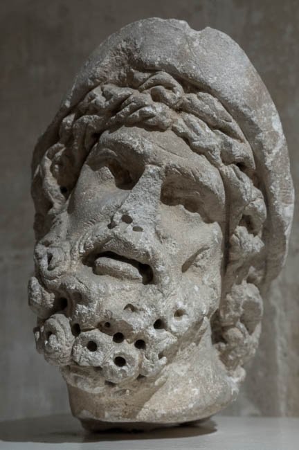 - Mythische Figur: bärtiger , zu seiner linken Schulter gedrehter Kopf mit zurückgeschobenem Helm. Mars (?).