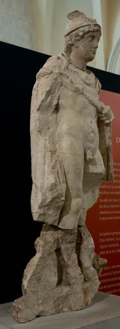 - Mythische Figur: stehender Mercur mit Flügelkappe. Neben dem rechten Bein liegendes Tier (?).