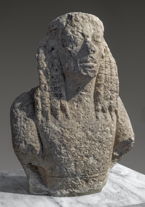 - bestoßen, linke Gesichtshälfte abgeschlagen, Spuren der Bemalung erhalten