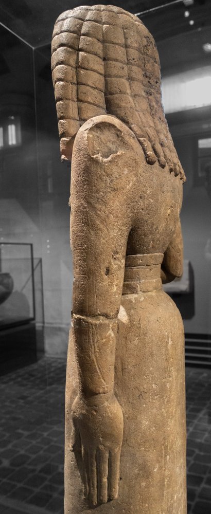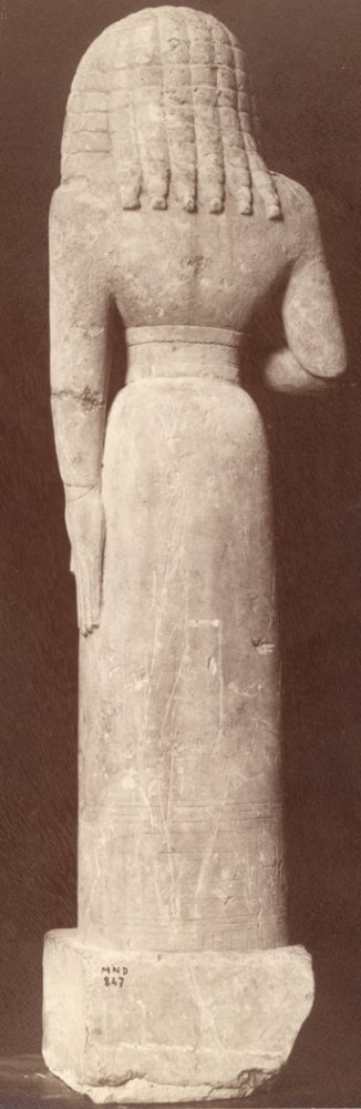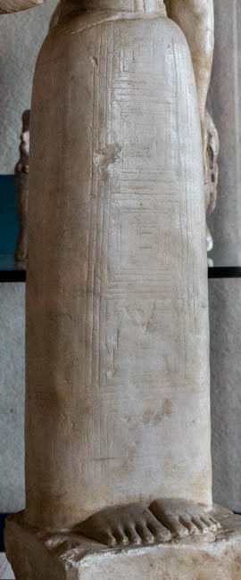- Stehende Frau (Kore) in eng anliegendem Kleid mit breitem Gürtel, um die Schultern kleiner Umhang mit Randborte. Auf dem Oberteil des Kleides Schuppenmuster, auf dem Rock vorn eingeritzte Rechtecke und Quadrate zwischen vertikalen Linien. Um die Handgelenke Armbänder.