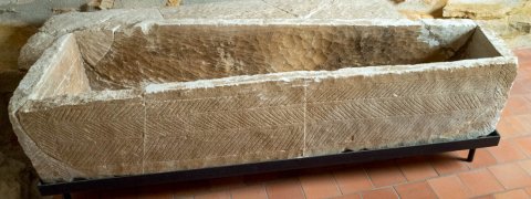 - Auf den Längsseiten des Kastens Ritzdekor (an den Ecken vertikale Streifen mit Fischgrätmuster, dazwischen horizontale Streifen, gefüllt mit schrägen Linien).