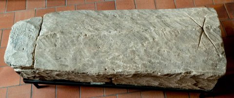 - Kasten grob geglättete, Deckel in Form eines flachen Satteldaches, auf dem Kopfende eingeritztes liegendes X.