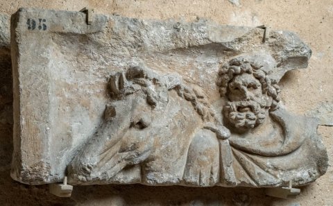 - Mythische Figur: Oberteil eines bärtigen Mannes mit Kappe (pileus) und Mantel, hinter ihm Pferd. Dioskur Castor?
