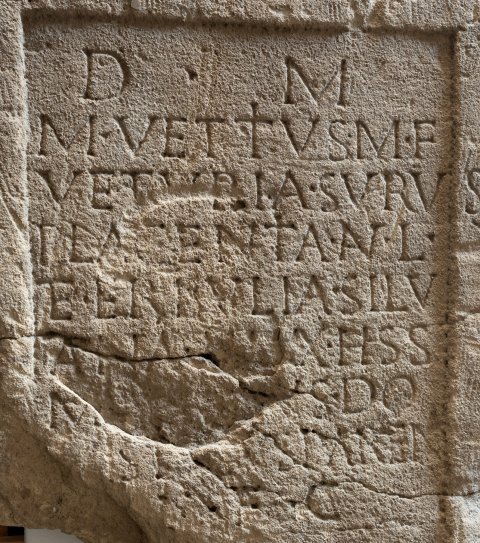 - D(is) M(anibus) / M(arcus) Vettius M(arci) f(ilius) / Veturia Surus / Placentia an(norum) L / et Erbulia Silv/ana an(norum) LXX h(ic) s(iti) s(unt) / M(arcus Vetti)us Do/(m)esti(c)us paren/(tibu)s f(aciendum) c(uravit)