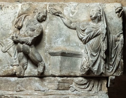 Friesecke. Mythos: auf der Vorderseite Altar, rechts davor Iphigenie mit über den Kopf gezogenem Mantel, in der erhobenen Rechten Lorbeerzweig, den sie über den Kopf des von links herantretenden gefesselten Orest hält. Links folgt ein bärtiger Skythe (Thoas ?) mit Speer.