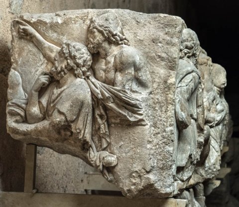 Auf der linken Nebenseite Odysseus, der sich zu einem vor ihm sitzenden bärtigen Mann (Kalchas ?) vorbeugt und nach vorn zeigt. Anschließend weitere sitzende Person. Unten Gesims mit Palmettenfries und Architrav mit tordiertem Band und Perlstab. - Kommentar