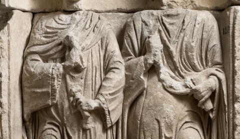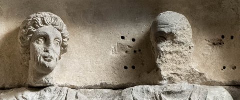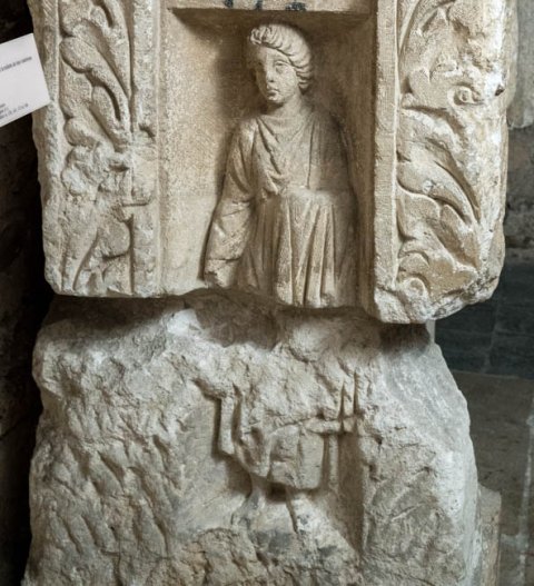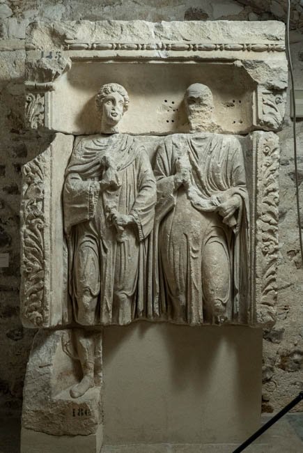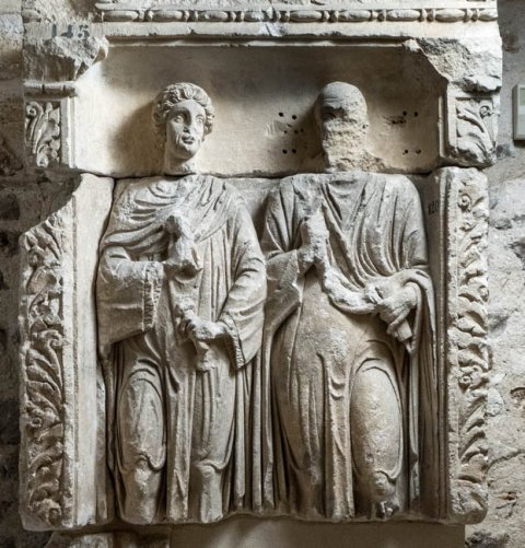 - Auf der Vorderseite in Rechtecknische stehendes Ehepaar in Ärmelgewand und Mantel. Die Frau hält ein Tuch (mappa?) und ein Flakon (?), der Mann Rolle (volumen). Auf den Nebenseiten links zwei Dienerinnen, rechts zwei Diener, jeweils in zwei übereinander gestellten Rechtecknischen. An den vier Ecken Pilaster mit vegetabilem Dekor, darüber Architrav mit Astragalstab.