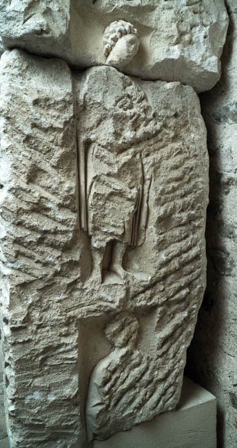 - aus 4 Fragmenten zusammengesetzt, rechte untere Ecke fehlt, Seitenkanten u. Rahmenleisten tlw. abgebr., Relief bestoßen, auf der rechten Nebenseite abgearbeitet, Sockel u. Aufsatz fehlen