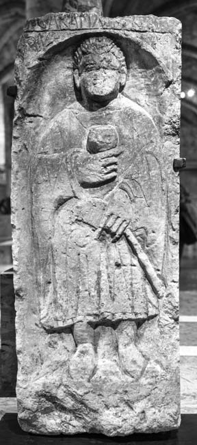 - in Bogennische stehender bartloser Mann im Ärmelgewand, in der Rechten Becher, in der Linken Winzermesser. Inschrift über dem Bogen.