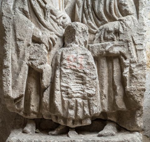 - Familie: auf dem rahmenlosen Sockel mit der Inschrift Ganzfiguren eines Ehepaares mit Kind (Großeltern mit Enkelin), alle in Mänteln. Mann bärtig mit geschlossenen Schreibtafeln in der Linken. Attribute der Frau nicht erkennbar (in der Rechten Fächer ?).