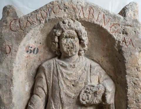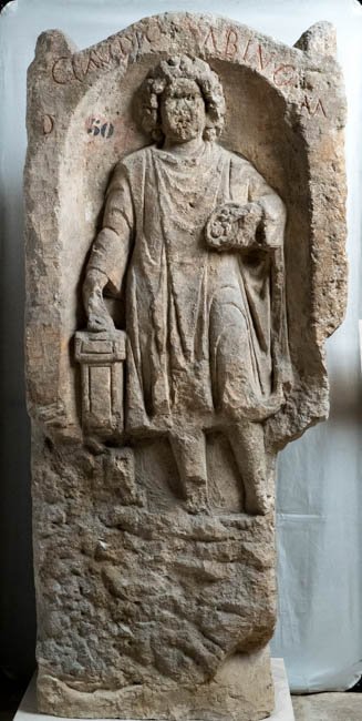 - Bogennische mit Akroteren. Stehender bartloser Mann (Jüngling) mit langen Locken, kurzes Ärmelgewand, opfert mit der Rechten über einem Altar, in der Linken Schale mit Früchten.