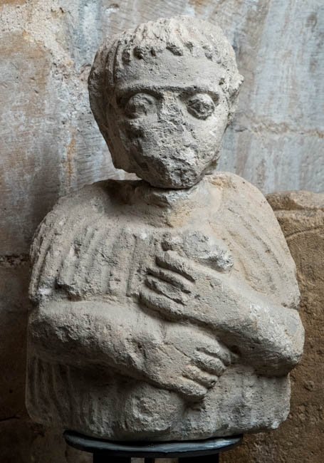 - Kind (Knabe) in Tunica, drückt mit beiden Händen ein Tier (Hund ?) an die Brust. Grabstatue.