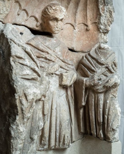 - In einer Nische mit Muschelbaldachin drei stehende Personen einer Familie: in der Mitte Frau im Mantel, in der linken Hand Kästchen, in der rechten mappa. Seitlich von ihr je ein Mann im Mantel, der linke mit Geldbeutel und geschlossenen Schreibtafeln (Diptychon).