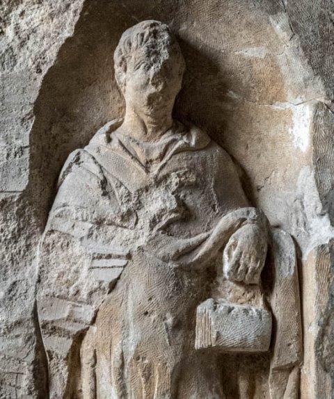- In einer Bogennische stehender bartloser Mann im Kapuzenmantel, in der Linken zusammengeklapptes Polyptychon.