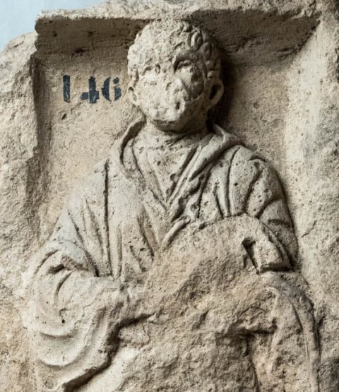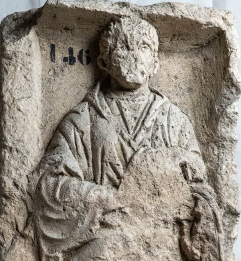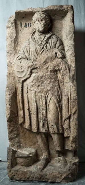 - Rechteckige Nische, darin stehender bärtiger Mann im kurzen Kapuzenmantel, in den Händen größeres Objekt (Geldbeutel ?). Neben dem rechten Fuß rundes Deckelgefäß.