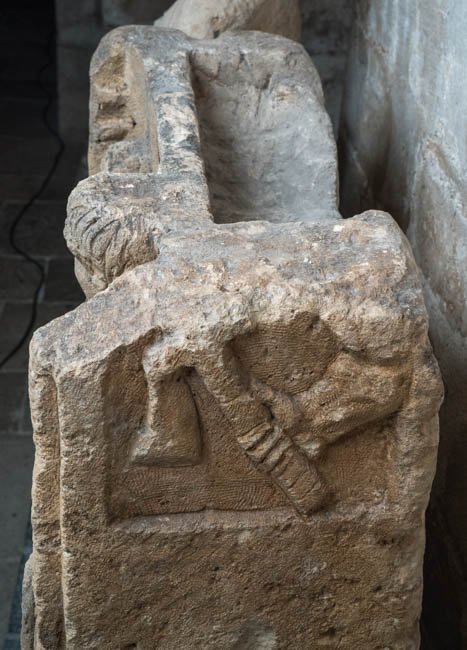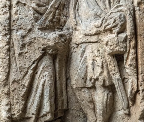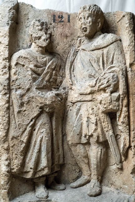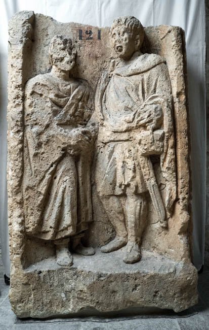 - Oben Ansatz eines Bogens auf Pilastern. Stehendes Ehepaar, bartloser Mann (Soldat) in kurzer gegürteter Tunica, Kapuzenmantel und Sandalen, an der linken Seite langes Schwert mit Scheide, die linke Hand hält zusammengeklapptes Polyptychon. Frau in Mantel und Schuhen, in der Linken mappa. Auf der rechten Nebenseite oben eckiges Bildfeld mit rechtem Arm, in der Hand ascia.