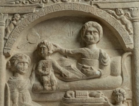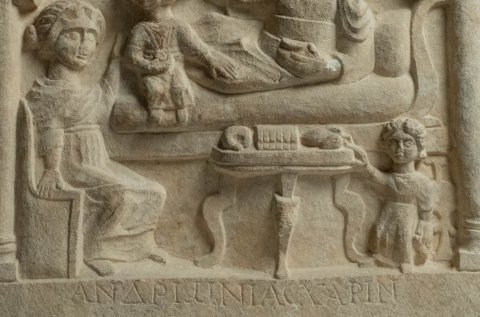 - Flacher Giebel mit Palmettenakroteren, im Giebelfeld Maske (Gorgoneion ?) zwischen Ranken. Von Säulen getragener Architrav, in der Mitte offen und von Bogenrahmen überschnitten. Unter dem Bogen Totenmahl: Kline mit gelagerter Frau (?), bei ihren Füßen sitzendes Kind. Links Frau auf Sessel. Vorn Tischchen mit Speisen, daneben kleine Dienerin. Über der Kline hängender Handspiegel und Winzermesser. In den Zwickeln zwischen Bogen und Säulen je ein Erot (Genius). Inschrift auf dem Bogenrahmen und dem Sockel.