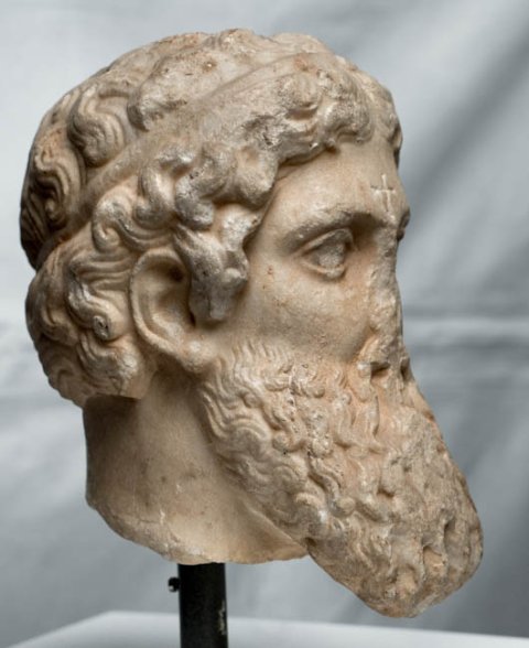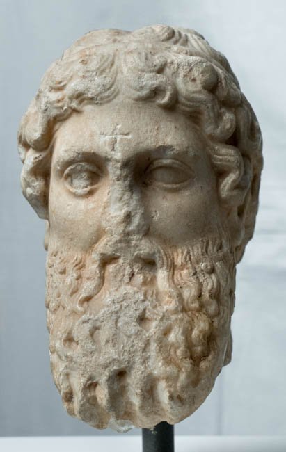 - Mythische Figur: Kopf eines Gottes (Hermes ?) mit Binde im gelockten Haar und langem Vollbart. Von einer Herme ? Auf der Stirn sekundär eingeritztes Kreuz.