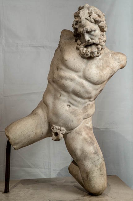 - bärtiger, nackter, auf das linke Knie gesunkener Barbar