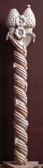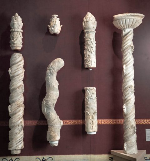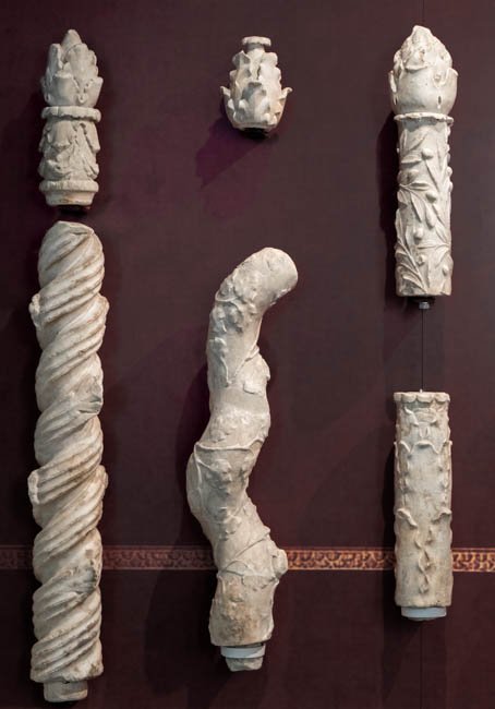 - Fragmente von Säulchen mit tordierten Bändern um den Schaft, eines trägt zwei Pinienzapfen mit Rosetten, ein anderes eine Schale. Fragmente von Säulchen mit Blattdekor, mit Olivenzweigen und Pinienzapfenbekrönung. Gewundener Säulenschaft mit Efeuranken.