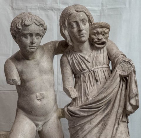 - Kindergruppe: nackter Knabe in Schrittstellung, linker Arm um den Nacken eines Mädchens in Tunica und Mantel gelegt, in der Hand Theatermaske.