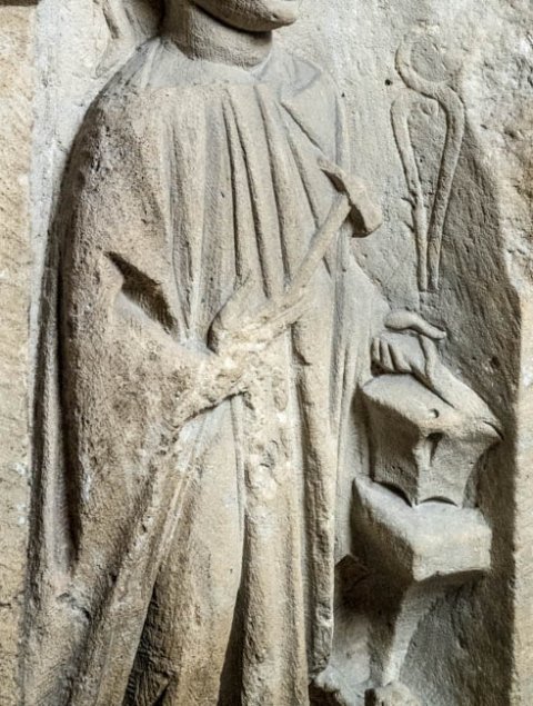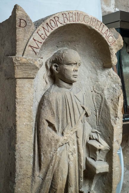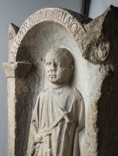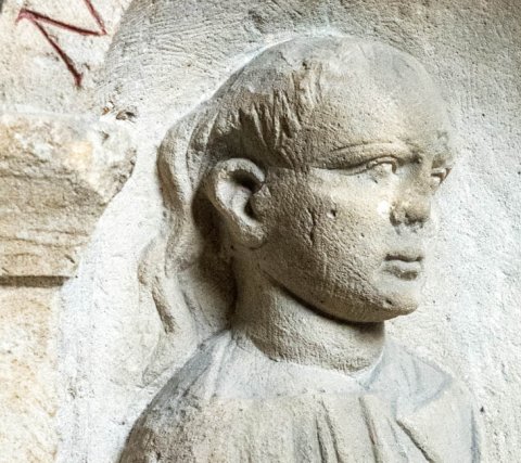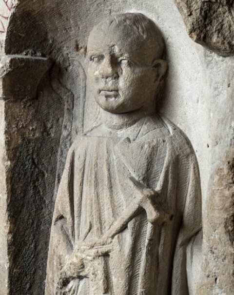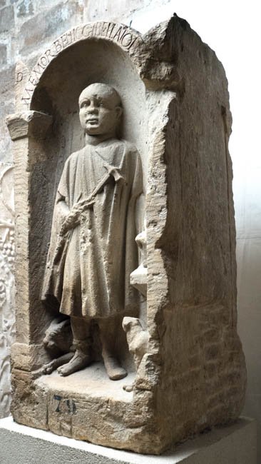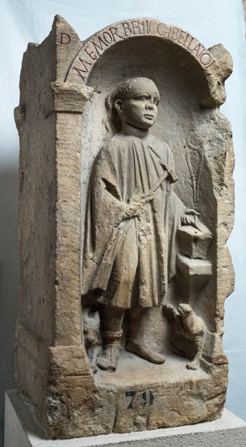 - In einer Bogennische mit Akroteren stehendes Kind (Knabe) mit Horuslocke, in Mantel und Schuhen, in der Rechten Hammer, in der Linken Henkel eines Kästchens. Neben jedem Fuß ein Hund. An allen vier Ecken Pilaster. Inschrift in den Akroteren und auf dem Bogenrahmen.