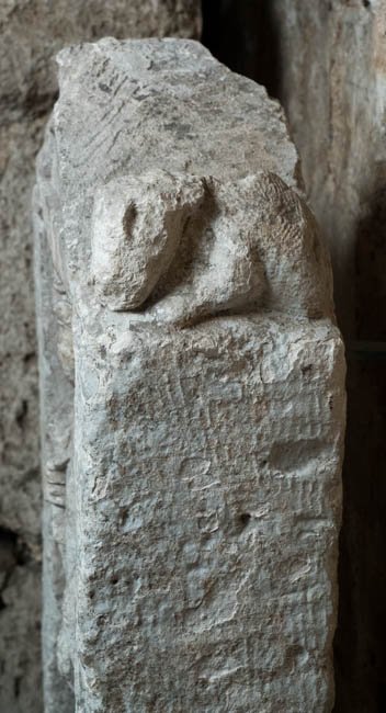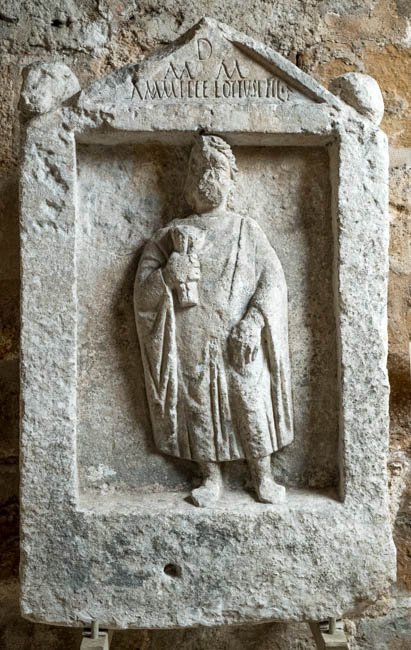 - Stele mit Giebel, auf den Giebelecken liegende Tiere (Hund?). In Rechtecknische stehende Frau im Ärmelgewand, in der Rechten mappa. Inschrift im Giebelfeld.