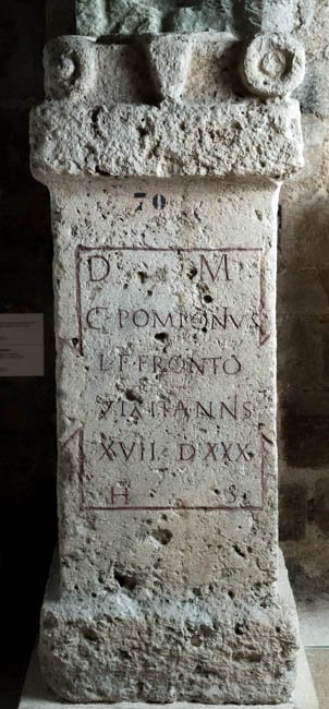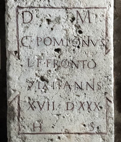 - D(is) M(anibus) / C(aius) Pomponius / L(uci) f(ilius) Fronto / vixit annis / XVII d(iebus) XXX / h(ic) s(itus)