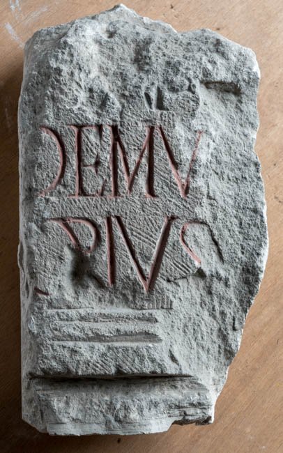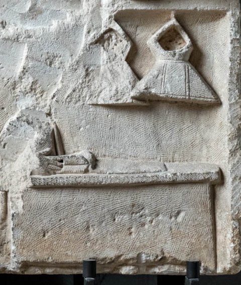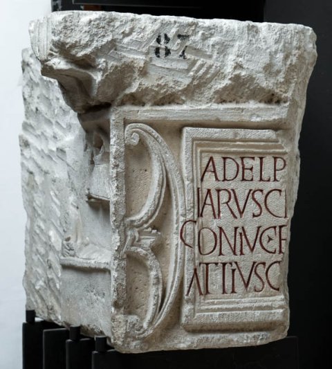 - Eckblock: auf der Vorderseite Inschrift in tabula ansata mit Peltenhenkeln, darüber vorspringendes Gesims. Auf der linken Nebenseite Reliefbild eines Schneiders, der auf einem truhenartigen Tisch Stoff schneidet. Darüber zwei hängende Kapuzenmäntel. Restliches Relief abgemeißelt.