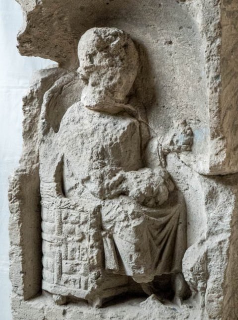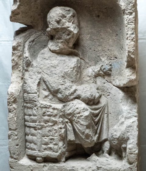 - In Bogennische Frau auf einem Korbsessel, auf den Knien Früchte (?), in der linken Hand ?. Zu ihren Füßen Hund.