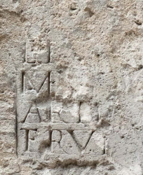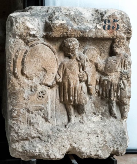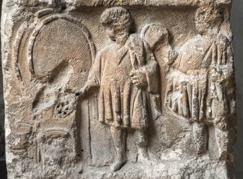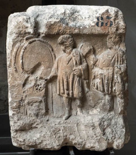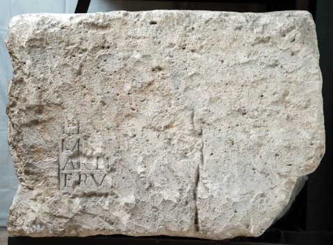 - Eckblock: auf der Vorderseite Inschriftrest (linke untere Ecke). Auf der links anschließenden Seite zwei stehende Männer neben einem Fass (?), darunter stehende Gefäße (Weinhandel ?). Auf Rückseite Reliefspuren (vier Personen).