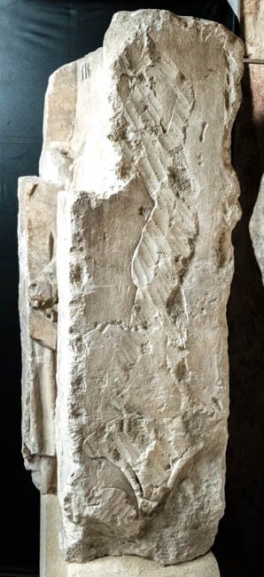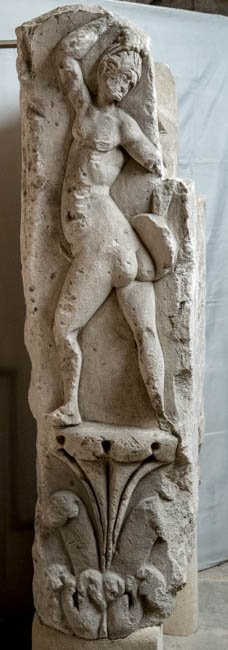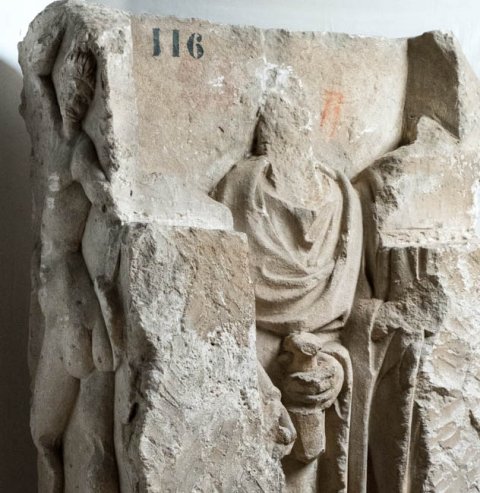 - oben u. unten abgebr., rechte Nebenseite u. seitliche Figuren der Vorderseite abgearbeitet