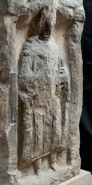 - Satteldach mit Giebel auf Pilastern, im Architrav Bogen für den Kopf der stehenden Frau im Mantel. In der Rechten Becher (?), in der Linken Flasche.