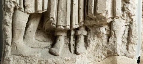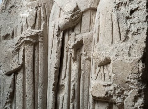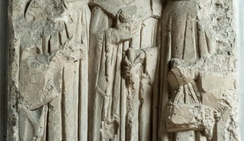 - Familie: in Bogennische drei stehende Personen (Frau in Mantel und hohen Schuhen, Becher in der Rechten, an ihrer linken Seite Mann im Mantel mit zusammen geklapptem Polyptychon in der Linken, an ihrer rechten Seite Jüngling mit langen Locken). Auf den Nebenseiten Reliefreste.