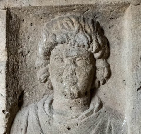 - Giebel mit Mondsichel. Darunter eckige Nische mit Brustbild eines Jünglings mit lockigem Haar und Halstuch.