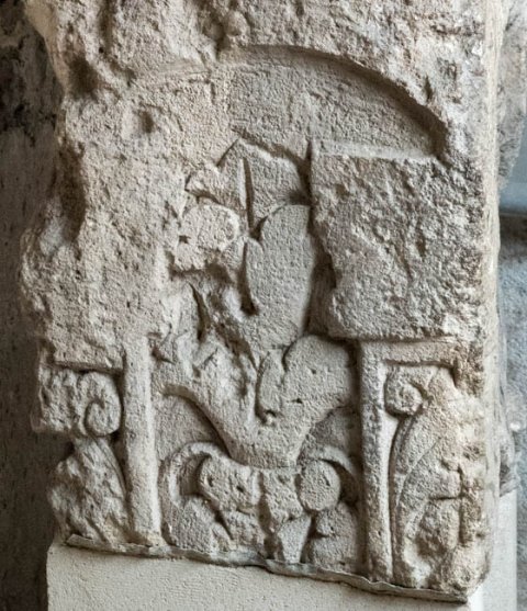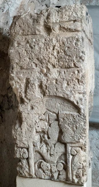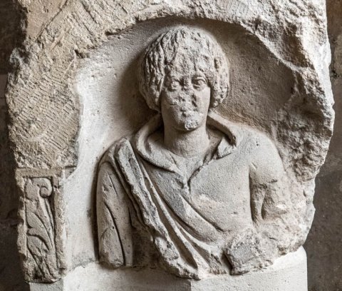 - In Bogennische stehender Jüngling (junge Frau ?) in Paenula. An den vier Ecken des Pfeilers Pilaster mit vegetabilem Dekor, dazwischen auf den Nebenseiten Blattkandelaber.