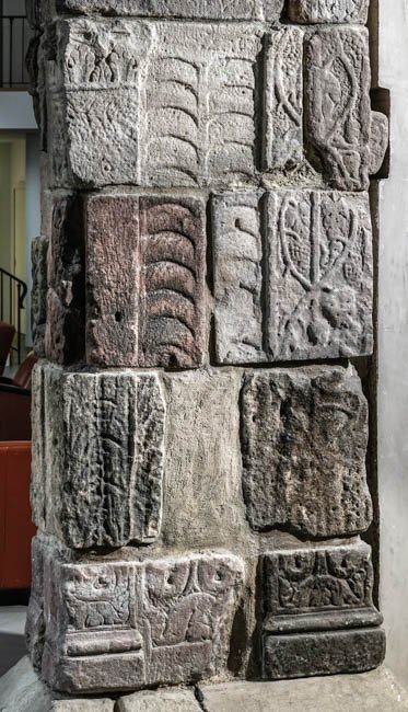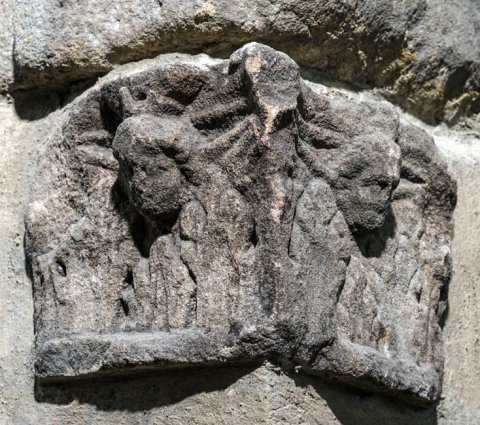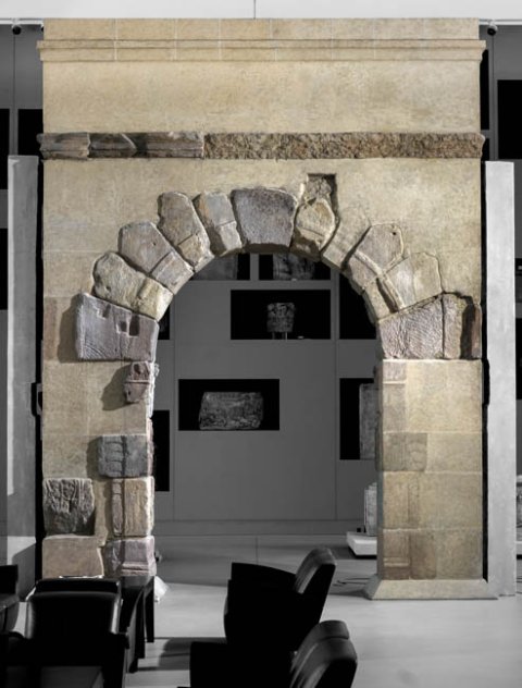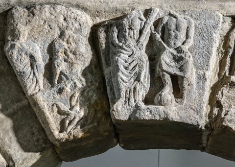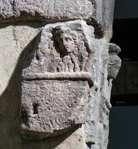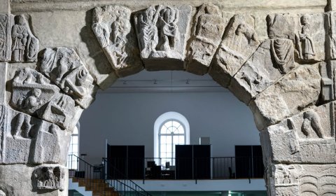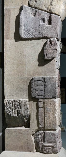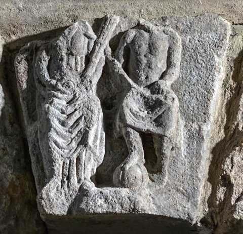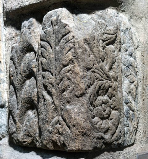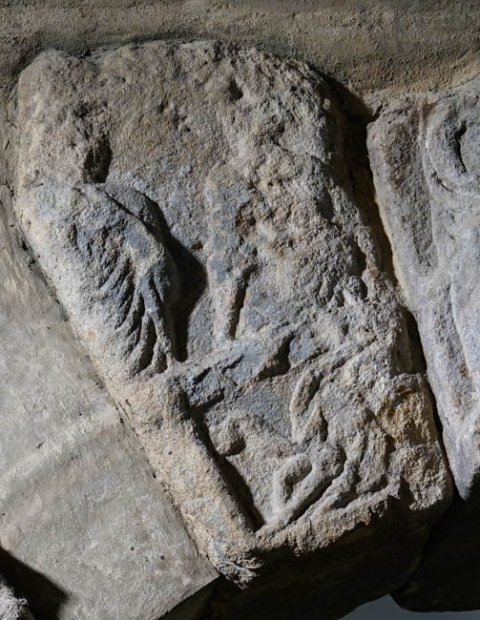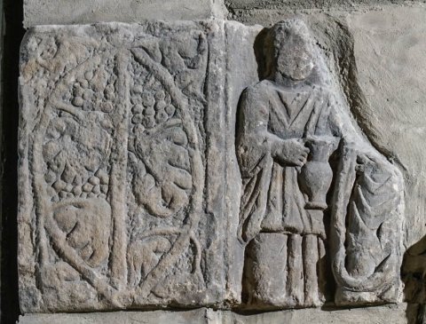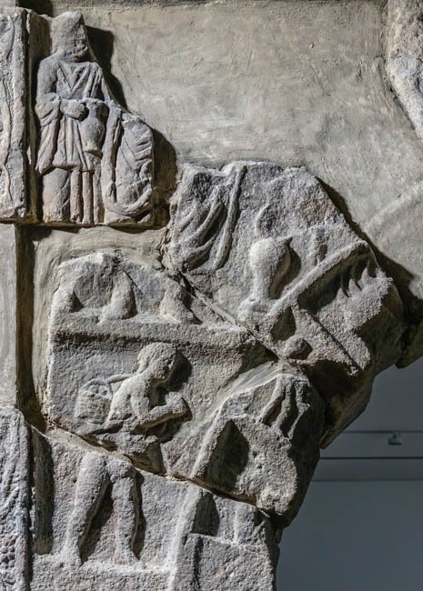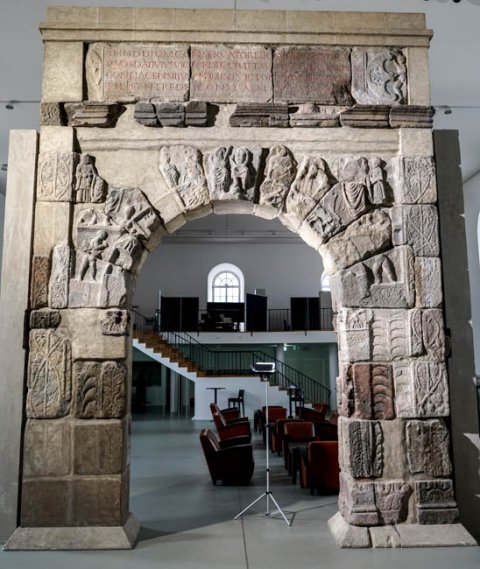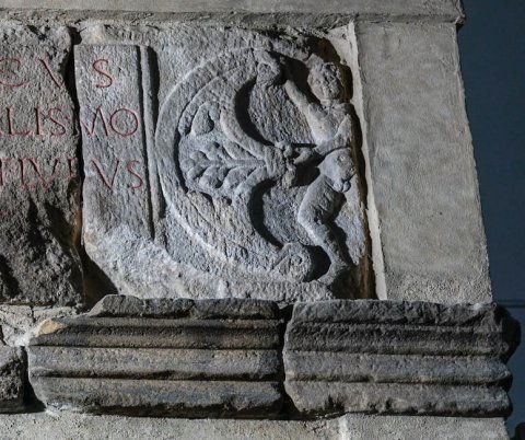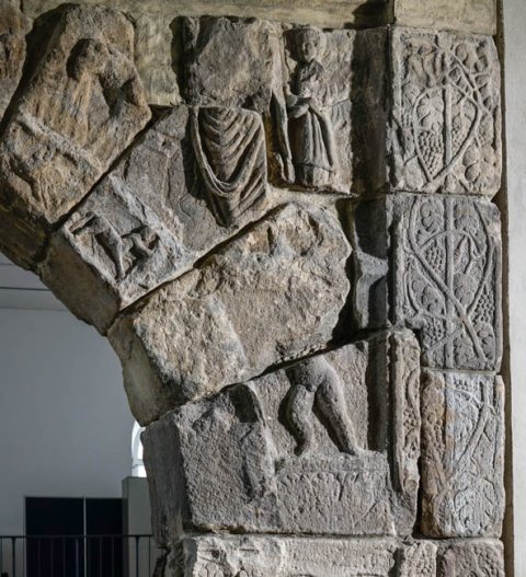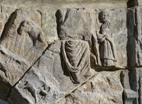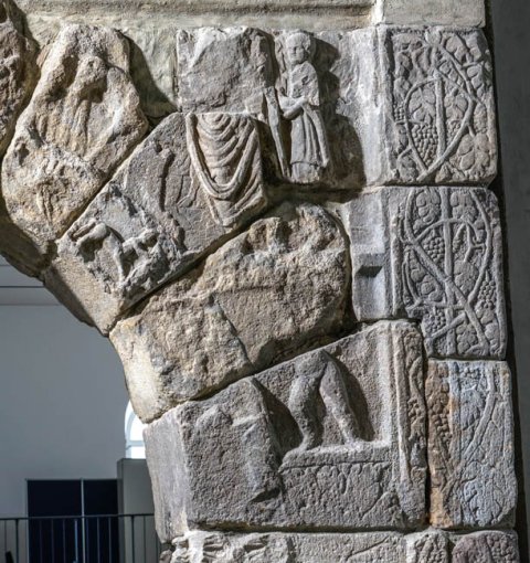- Auf der Vorderseite der Attika Inschrifttafel mit Peltenhenkeln, gehalten von nackten Jünglingen (Genius). Darunter profiliertes Gesims. Um die Bogenöffnung Keilsteine mit Tierkreiszeichen, auf dem Schlusstein thronendes Götterpaar (Jupiter und Juno), von je zwei weiteren Gottheiten flankiert. Nach außen zu folgen je eine Opferszene mit Jahreszeitenpersonifikationen, darunter je ein Erot. Ganz außen durchgehende Pilaster mit Weinranken, in der Pfeilerzone vegetabiler Dekor auf den Mittelfeldern und den Eckpilastern mit Büstenkapitellen beim Durchgang. Auf der Rückseite nur in der Pfeilerzone Fragmente mit vegetabilem Dekor erhalten.