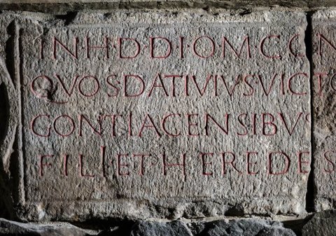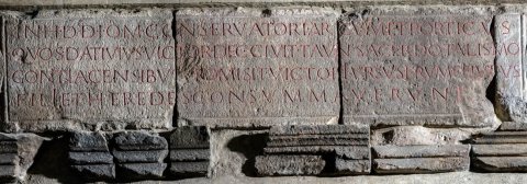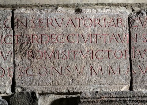 - In h(onorem) d(omus) d(ivinae) I(ovi) O(ptimo) M(aximo) Conservatori arcum et porticus / quos Dativius Victor dec(urio) civit(atis) Taun(ensium) sacerdotalis Mo/gontiacensibus [p]romisit Victorii Ursus frum(entarius) et Lupus / filii et heredes consummaverunt