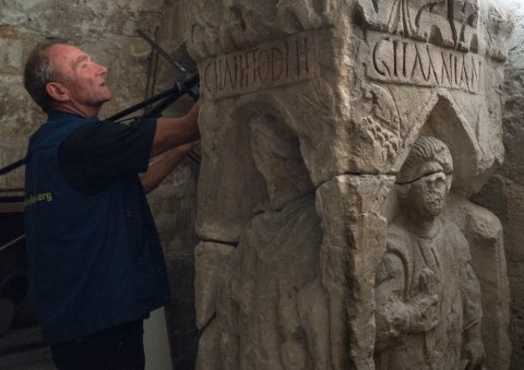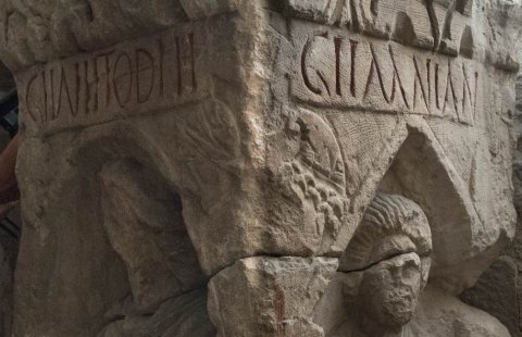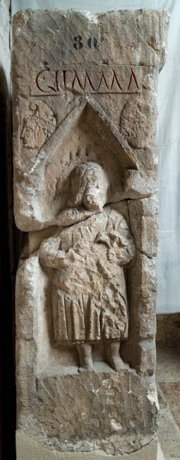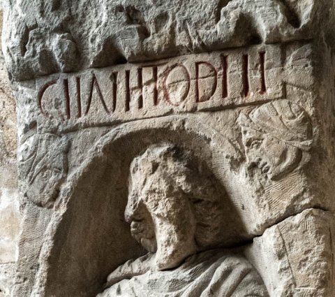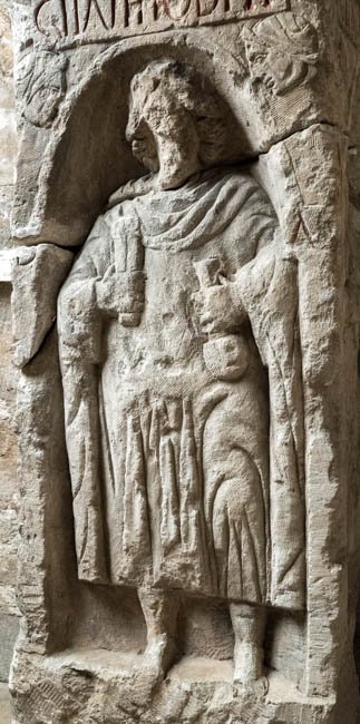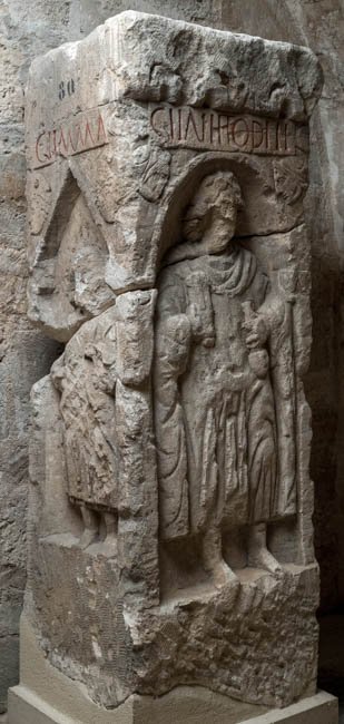 - Pfeiler mit Reliefs auf drei Seiten. Oben Blattkyma, darunter tabulae ansatae mit Namen. Auf der Vorderseite in Bogennische mit Pilastern stehende Frau im Mantel, in der Linken Flasche, in der Rechten ?. Seitlich des Bogens je ein Kopf mit Haube im Profil (Windgötter ?). Auf den Nebenseiten jeweils Giebelnische mit Pilastern, seitlich des Giebels Attisköpfe. Links stehendes Mädchen in Ober- und Unterkleid, auf der Linken Hand Vogel, in der Rechten Frucht (?). Rechts stehende Frau mit Mappa in der Rechten und Kästchen mit Henkel (Diptychon ?) in der Linken.