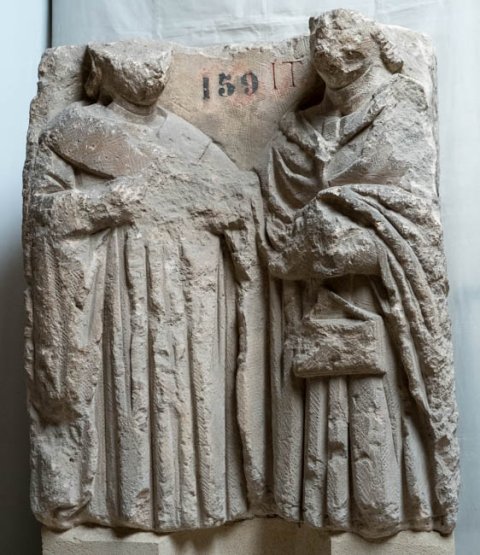 - Stehendes Ehepaar: bartloser Mann im Kapuzenmantel, in der Linken zusammen geklapptes Polyptychon. Frau im Mantel mit Schulterkragen, Attribut in der Rechten. Neben dem Kopf des Mannes Buchstaben IT.