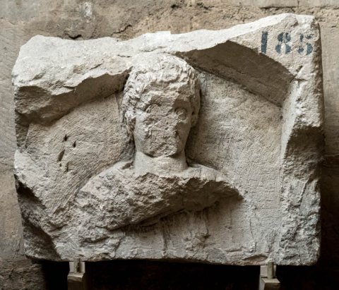 - Kopf und Schulterpartie eines Jünglings, darüber flacher Bogen