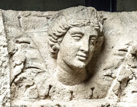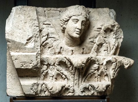 - Pilasterkapitell mit zwei Blattkränzen. Auf der rechten Seitenfläche Kopf einer Frau im Blattkelch. Links setzt leicht vorspringende Wand an (Eckpilaster ?).