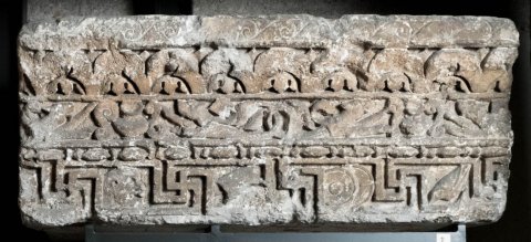- Unten Mäanderband mit Reliefs (Satyrkopf, Schilde, Vogel). Darüber Astragalstab und Fries mit Meerwesen (Kratere zwischen Seepanthern). Oben Kymation.
