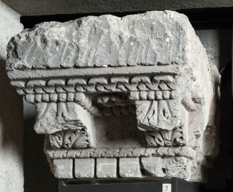 - Konsolgesims mit Zahnschnitt, Flechtband, Konsolen mit Akanthusdekor, tordiertem Band, Kymation