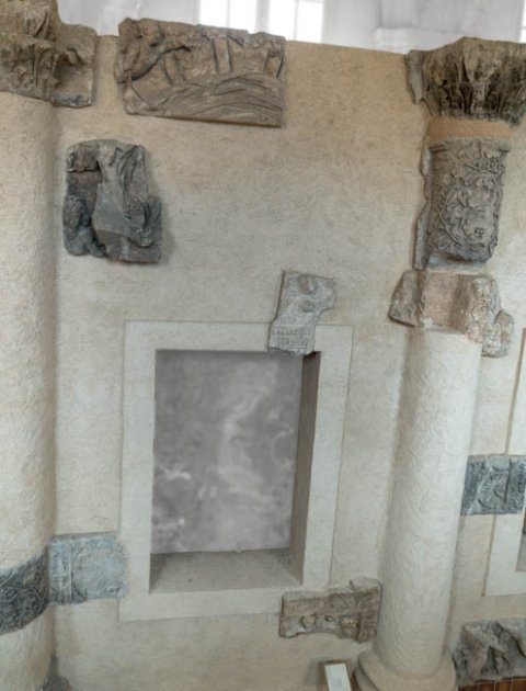 - zahlreiche Fragmente einer Fassade mit Halbsäulengliederung und großen Fensteröffnungen