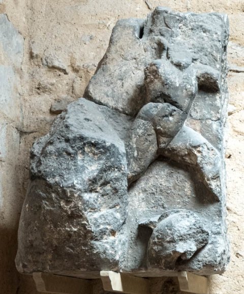 - Mythische Figur, Meerwesen: nach rechts hin laufender Erot, unter ihm Delphin, vor dem rechten Bein Hals eines großen Meerwesens. Block aus der Zone oberhalb der Fenster.