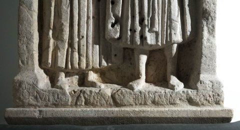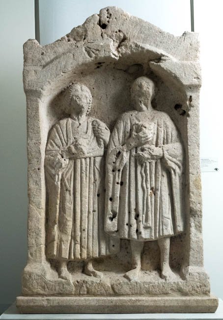 - Bogennische mit Pilastern, darüber Giebel mit Akroteren. Stehendes Ehepaar, Mann mit Becher (?), Frau mit Attributen in beiden Händen. Beide im Ärmelgewand, Frau mit Schultertuch.