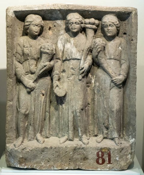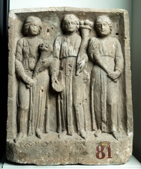 - Mythische Figuren: drei stehende Göttinnen (Matres) in langärmeligem gegürteten Gewand, alle mit Füllhorn, die mittlere auch mit Schale.